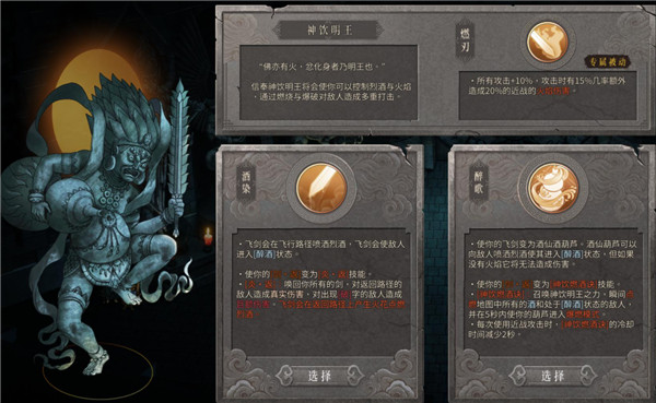 而投身“神饮明王”后,则可以获得能频繁施加“醉酒”状态,并有着丰富火焰伤害的混伤组合。在选择“醉歌”后,我还玩过一把靠酒葫芦施加火毒,给敌人快速叠debuff的毒酒流。