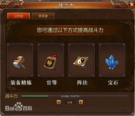 2.战斗力列表:点击战斗力武器即可进入战斗力列表页面,有各种提升战斗力方式来给予指示,还能从已开放和未开放的标签中了解到各种提升战斗力的信息。