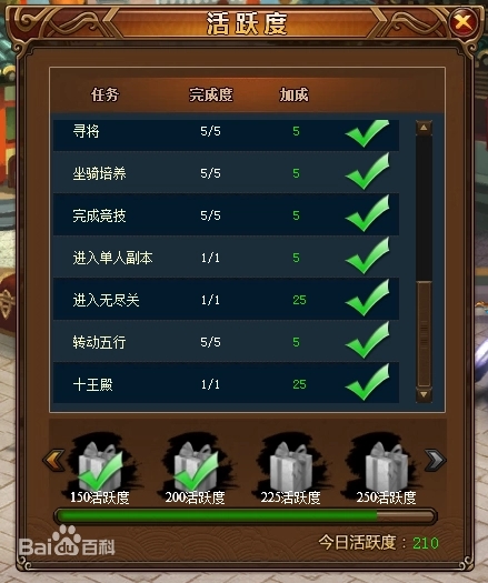 当活跃点数达到15,25,50,100,150,200,225,250时,都能获得活跃度礼包!