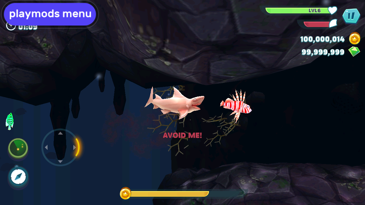在游戏中玩家可以用钻石购买怪兽鲨鱼,当然我们已经解锁了无限钻石,所以相当于免费获取,怪兽鲨鱼可是个无敌的存在,连鱼雷都可以吞食,没有任何害怕的东西。