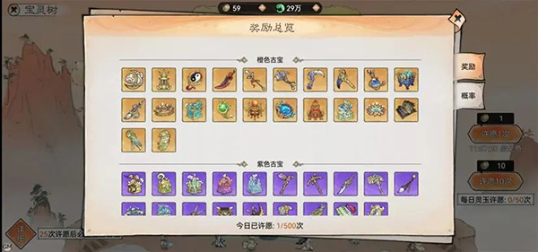 除了每天的免费许愿机会外,也可使用许愿币进行许愿。当免费许愿机会和许愿币耗尽时,还可花费灵玉进行许愿,灵玉许愿每天限制50次。而且宝灵树许愿设有保底次数,祖师们再也不用担心许愿不到橙色古宝啦!