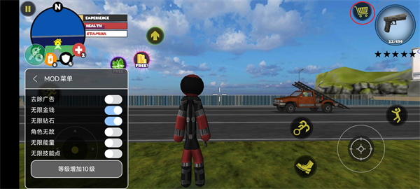 1、进入游戏先把菜单的无限金币打开,点击右上角的购物车。